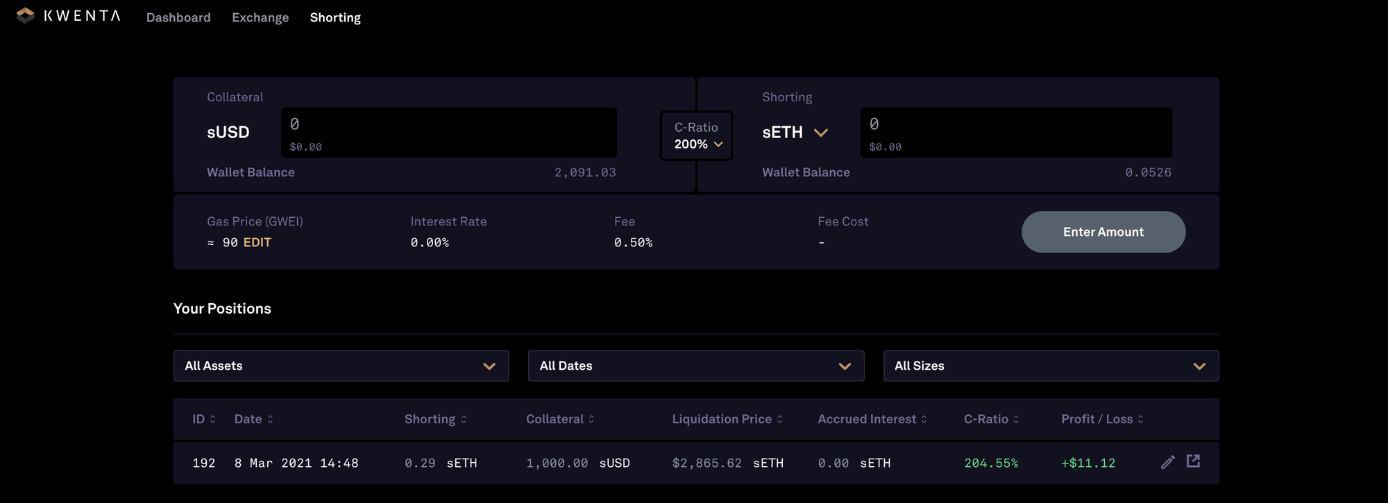 - Please note that this interface will only allow users to take out a short position at a ratio of 150% or higher, to ensure that there is a buffer to protect users from being liquidated due to relatively small price shifts.