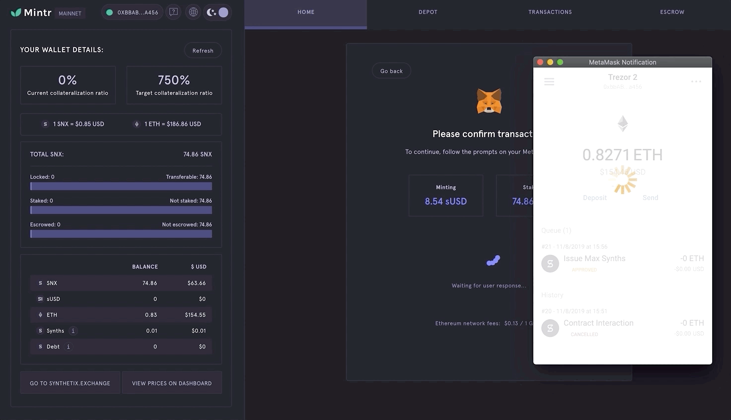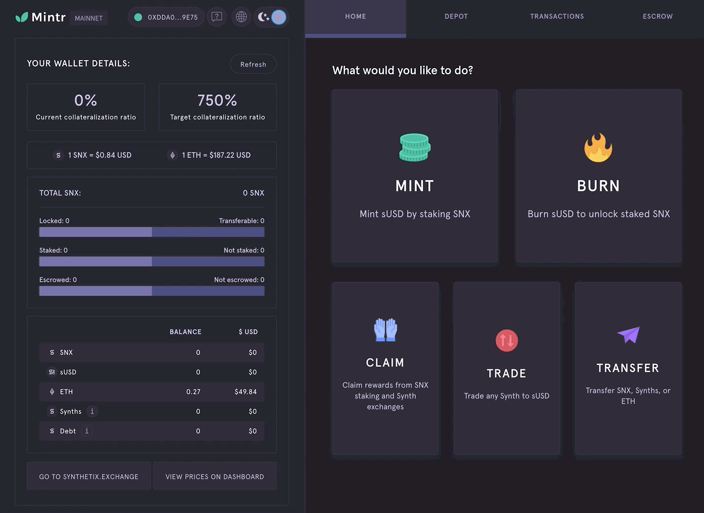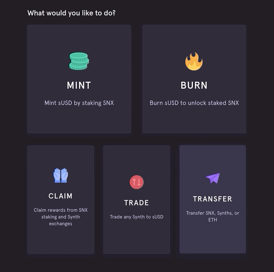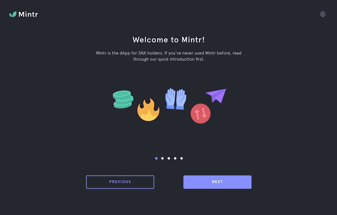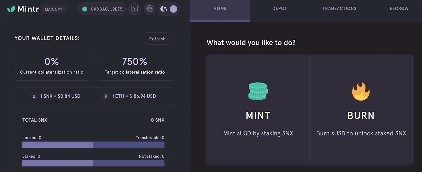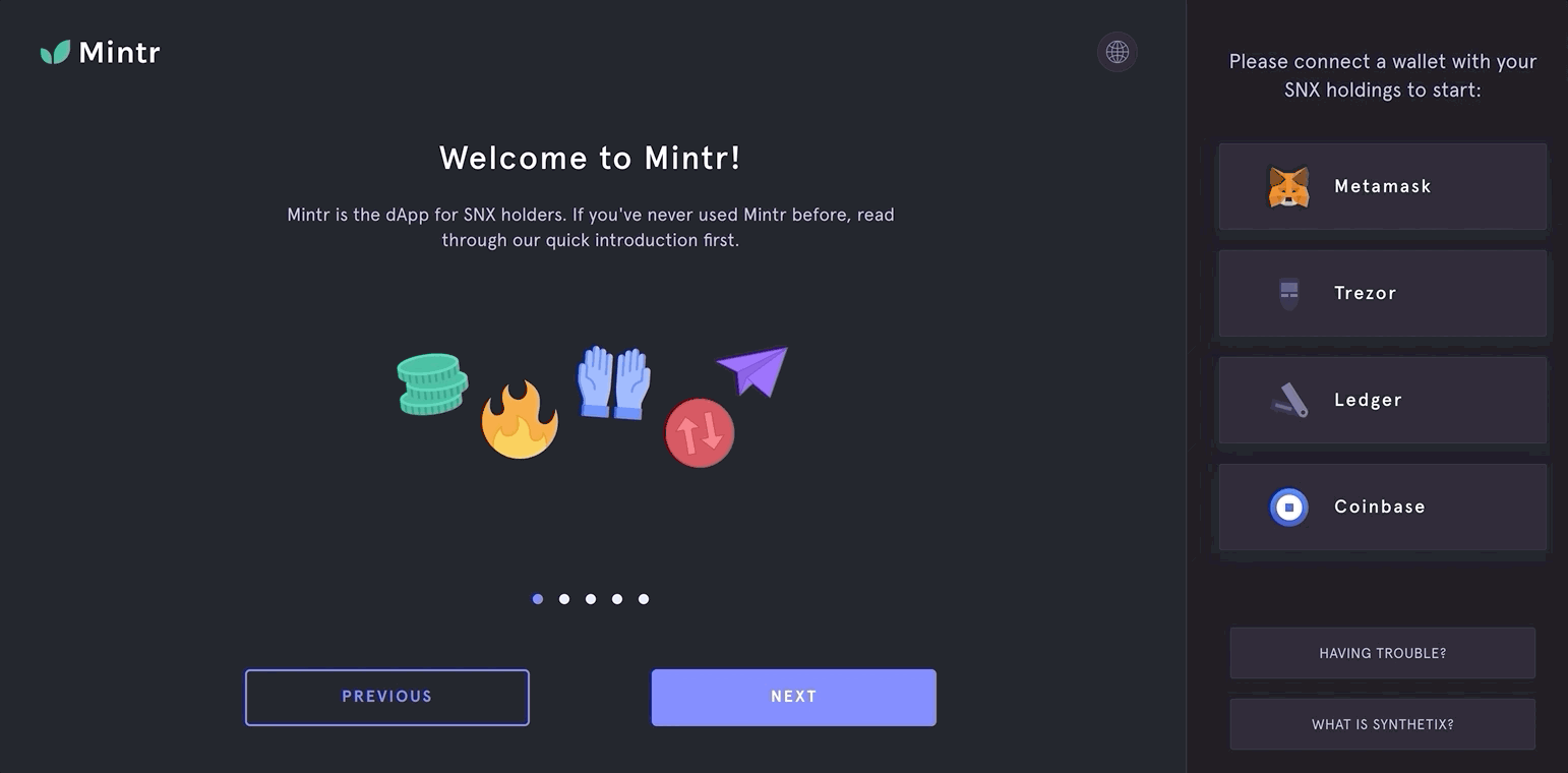 Many people arrive at Mintr for the first time without an understanding of how Synthetix works, so we've added a set of walkthrough slides introducing newcomers to the system, including what the risks are for staking SNX. If you're returning though, you can simply select your wallet from the side panel and head straight into the dApp.