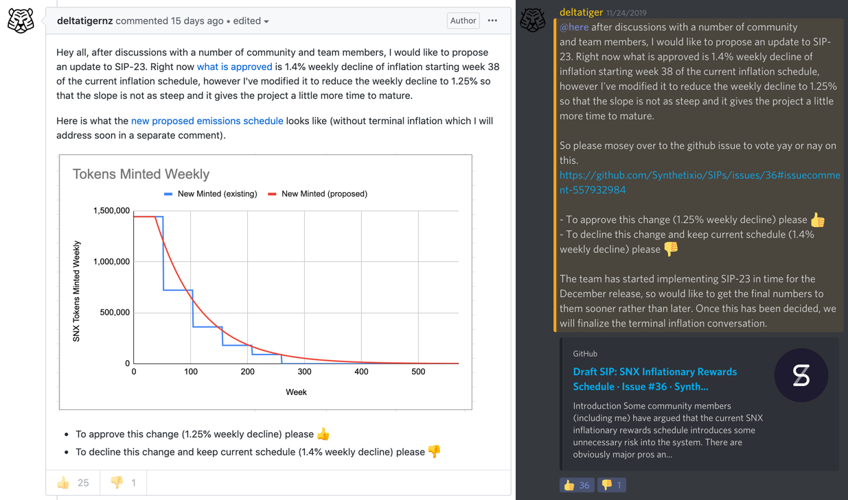On November 25 the community voted on Github and Discord for a 1.25% weekly rewards decline starting at week 40 (December 11, 2019). Note the emoji reactions beneath the posts: