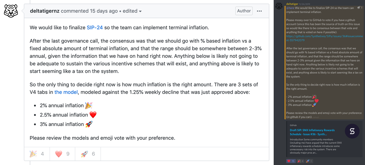 Hi everyone, I’m DeltaTiger, a Synthetix community member. I played a key role in a recent community decision that's going live this week in the Capella release, so the team reached out and asked if I could write up the process the community has gone through to reach consensus around an important system change: the inflationary monetary policy.