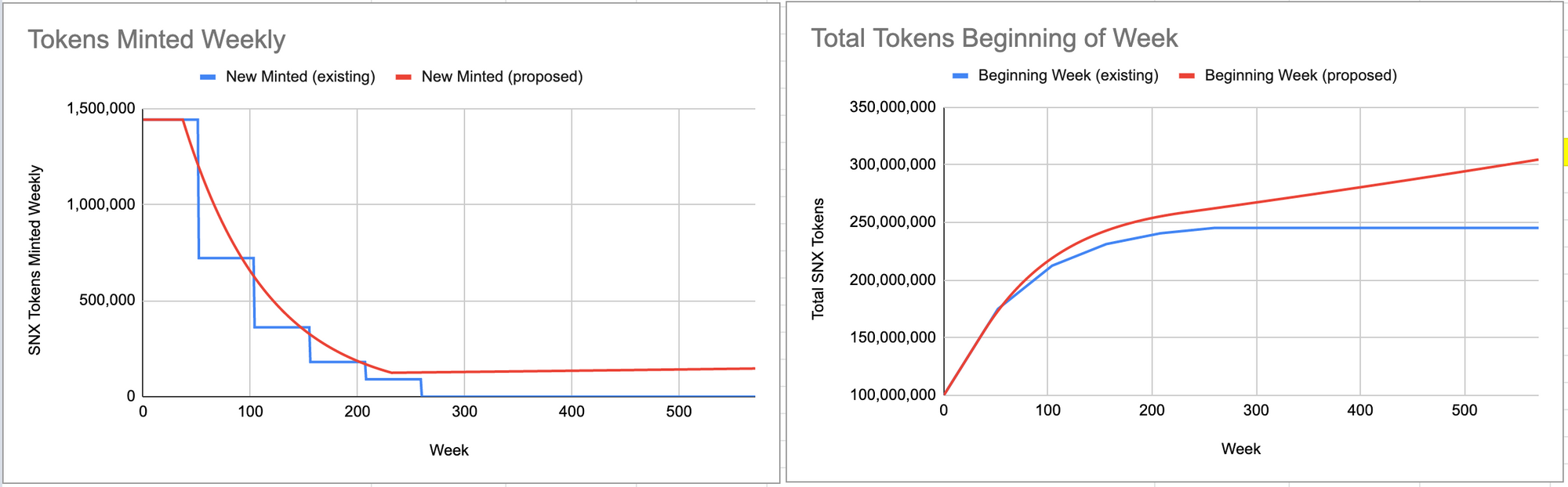 In this initial draft I proposed a model that starts reducing weekly rewards by 1.3% at week 30 (although my math was wrong so technically I was proposing week 32) and then introduce ongoing terminal inflation of 3% per year thereafter starting at week 208 (210). Here's the proposed schedule: