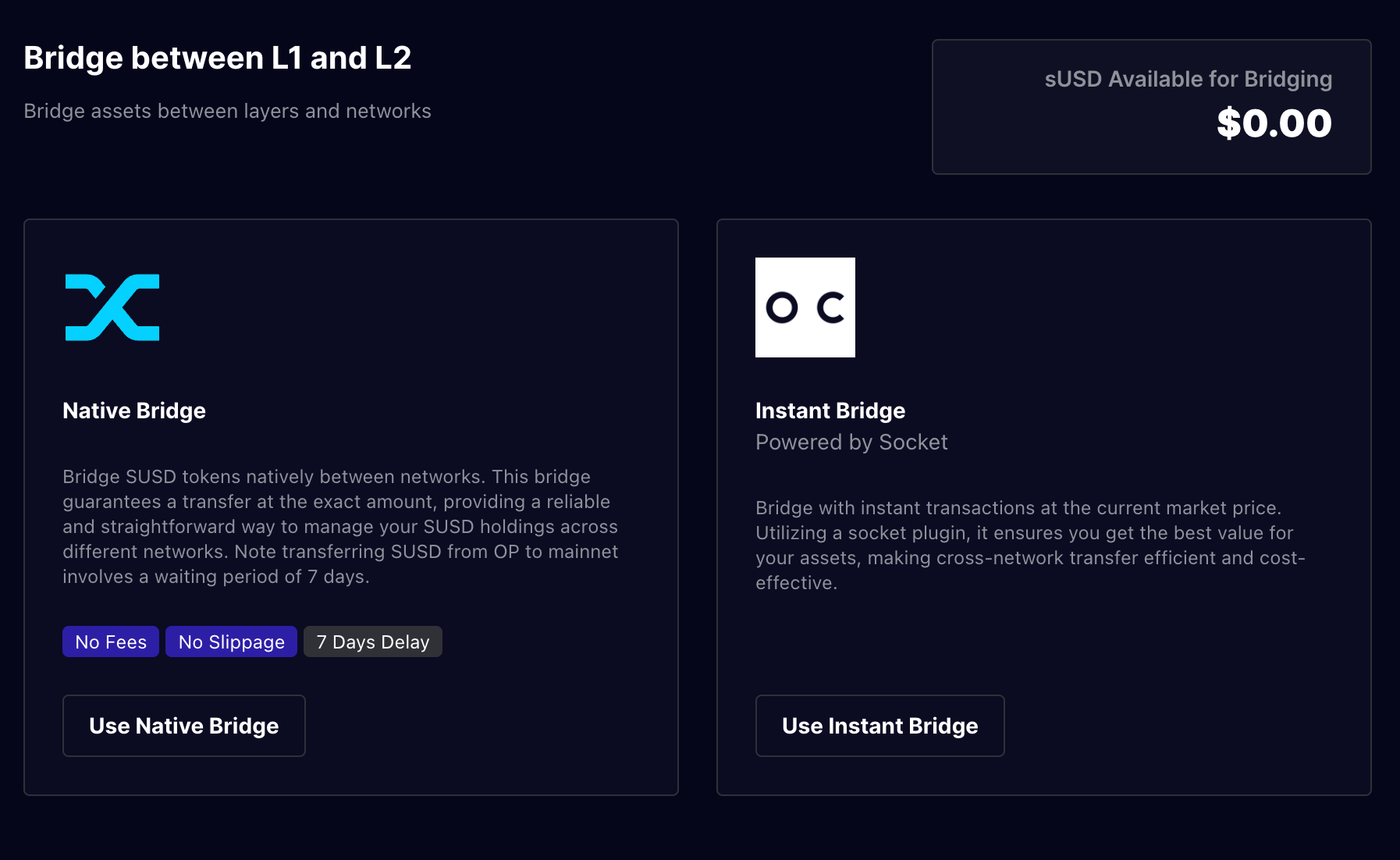 - The native bridge allows for sUSD transfers between Optimism and Ethereum Mainnet without slippage.