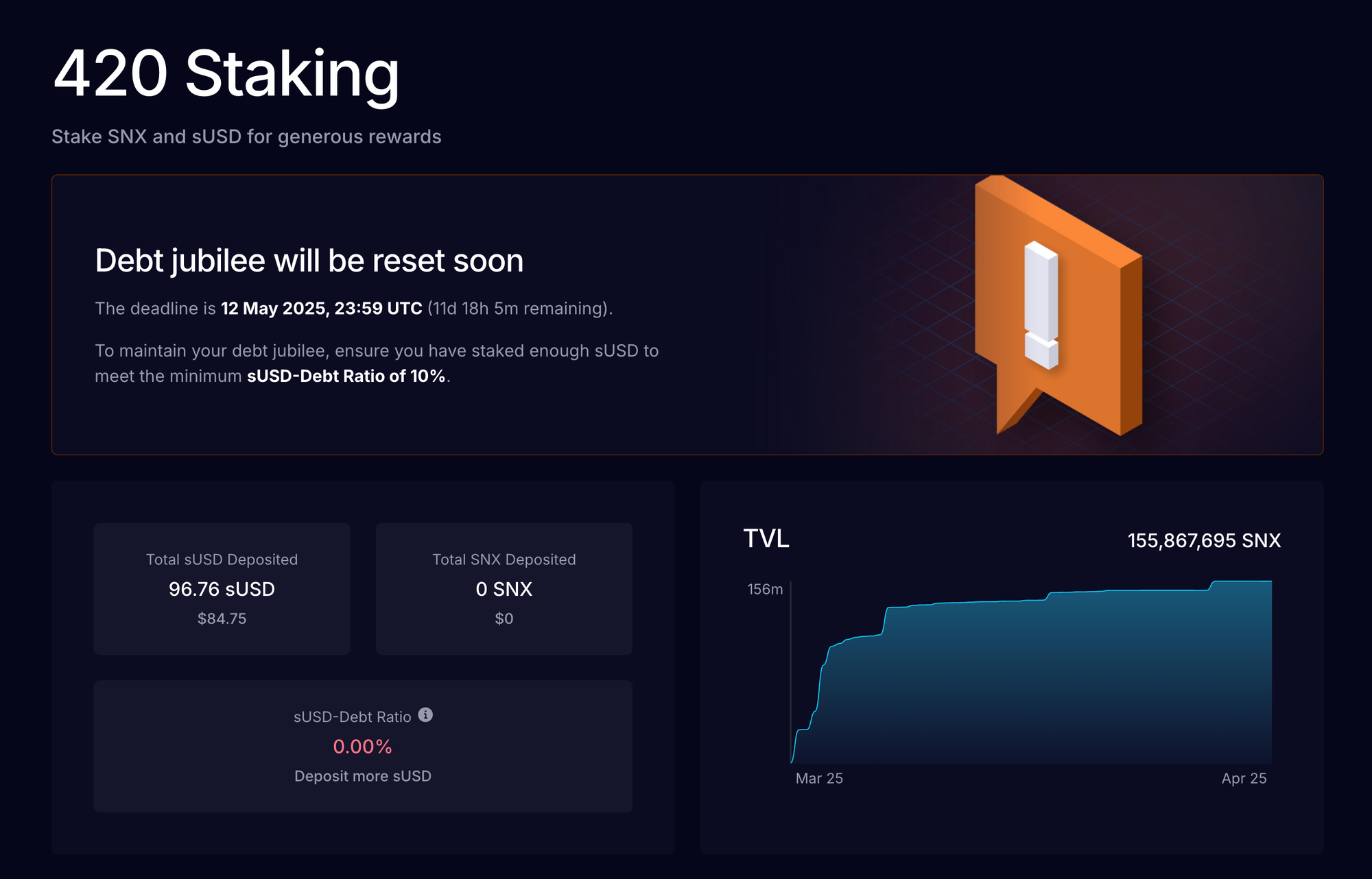To that end, Jubilee participants are now required to maintain a minimum sUSD:Original Debt ratio to continue their debt forgiveness progress.