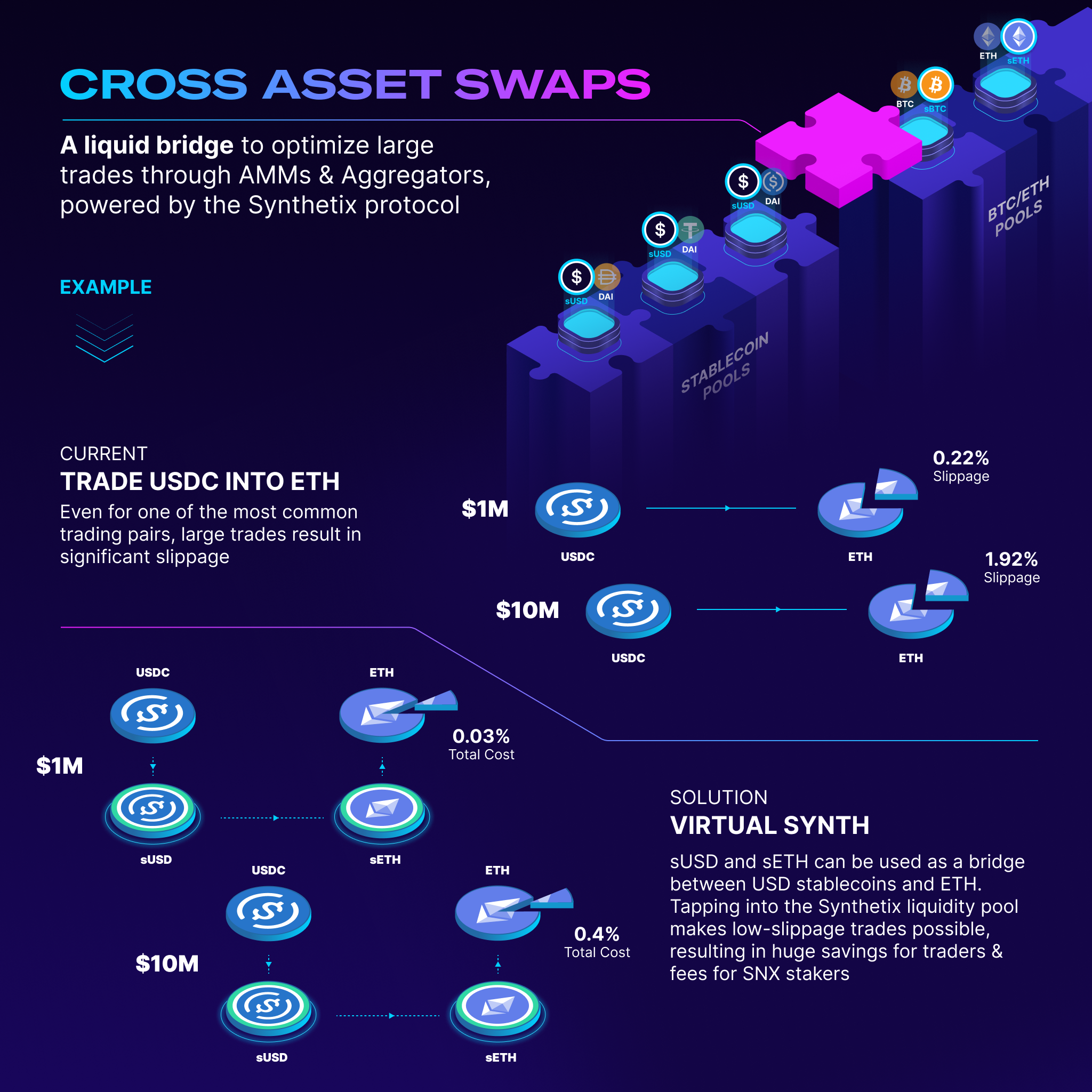 Atomic Swaps are a new exchange function allowing users to atomically exchange assets with a reasonable fee by pricing synth exchanges via a combination of Chainlink and DEX oracles (Uniswap V3) This helps to enable seamless trading between synthetic assets like sETH, sUSD, sBTC, etc. A unique property of this is that for large trade sizes, it greatly reduces the overall cost for traders due to slippage.