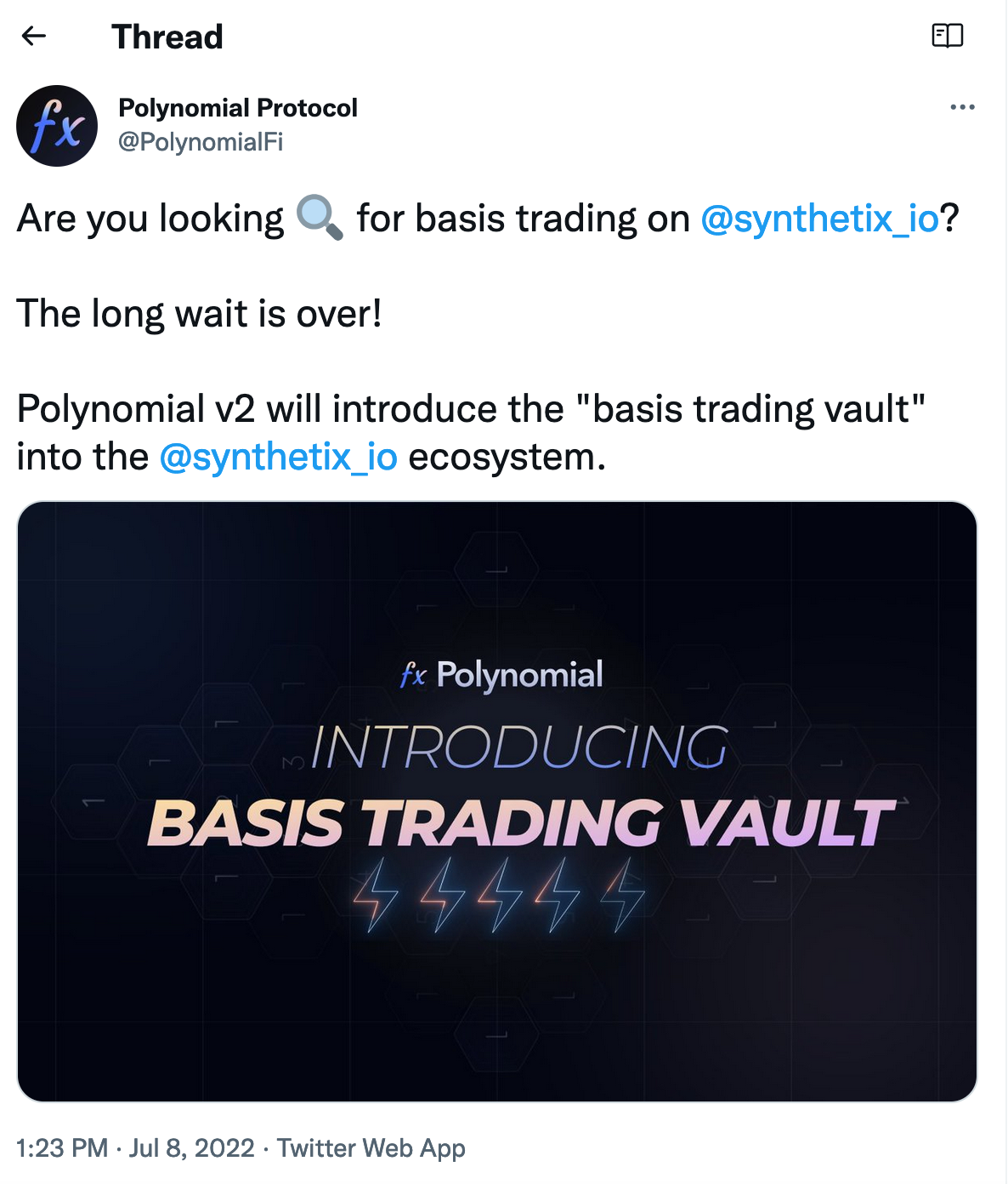 Kwenta isn’t the only one building ontop of futures, Polynomial is also building a basis trading vault to generate fees for users by capturing the inconsistencies between the spot market and its corresponding perpetual futures. In this strategy, they’ll try to collect funding rates by going long on the spot market and an equal amount short on the perpetual futures market.