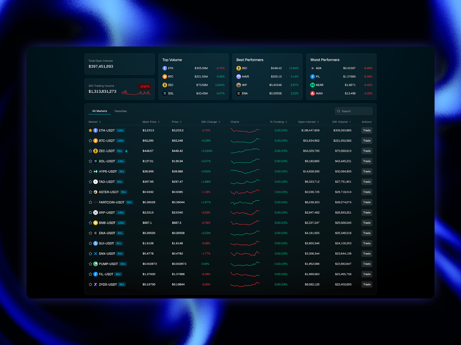 The markets dashboard is the only dashboard you’ll need to view top-line price action and identify the markets others are trading most. You can easily see the total open interest and 24-hour trading volume at the top of the page, as well as the top assets by volume, best performance, and worst performance assets in three clean sections.