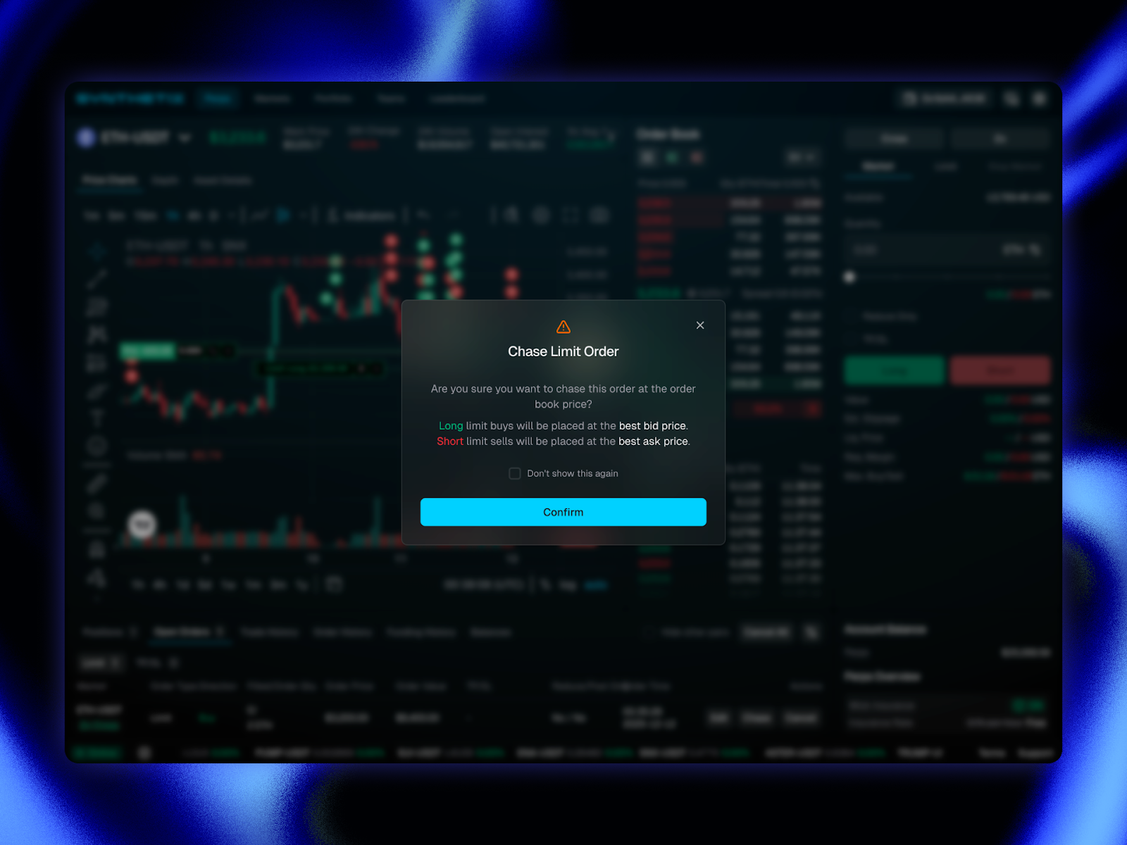 Tired of seeing the book run away from your limit orders? You can now 'chase' the book with your orders. In the order entry panel, you'll now notice a 'chase' option on the far right. This will position your limit order at the top of the book (best bid or ask).