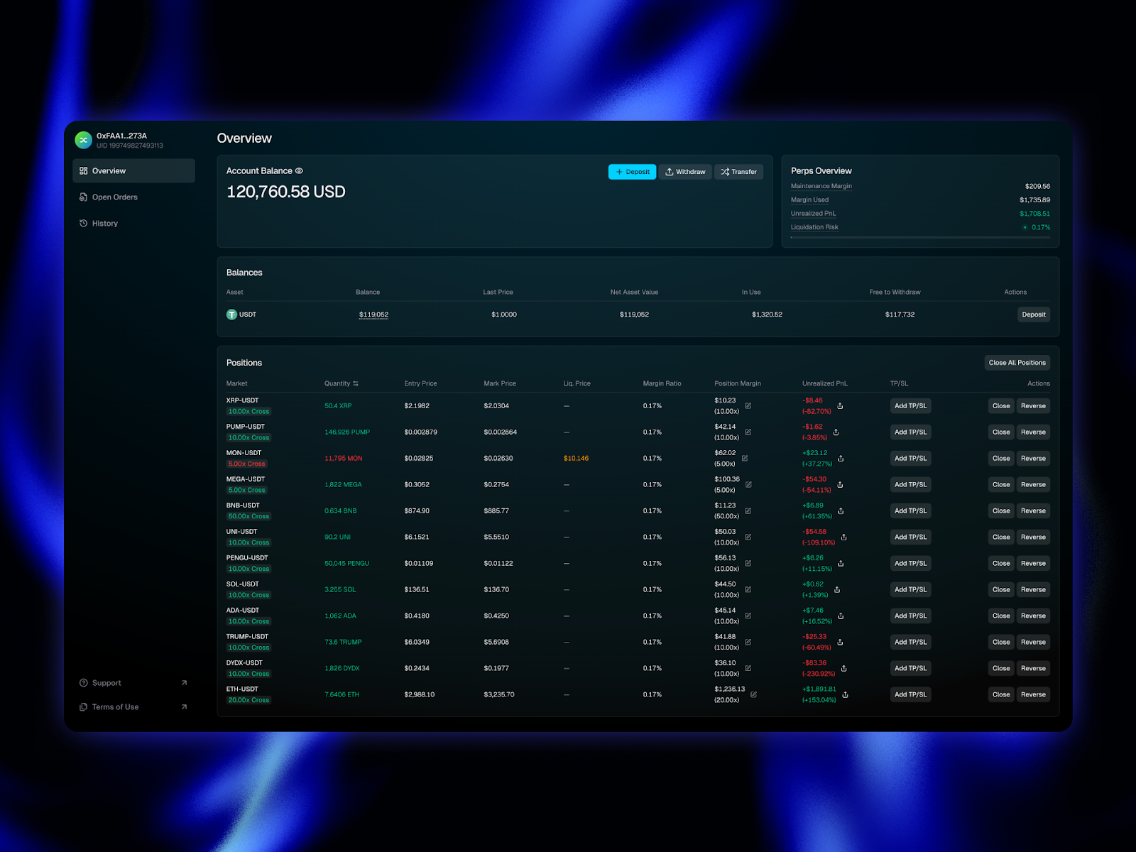 Synthetix Portfolio allows you to manage all your positions, view all of your balances, and active orders in one central hub. You can also view all of your open/closed orders, order/trade history, funding payments, and more.