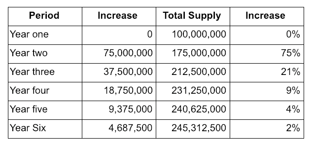 Having reached the conclusions outlined so far, we decided that the best way to deal with this issue is to use Bitcoin for inspiration and implement an inflationary reward system to incentivise SNX holders to mint Synths. The monetary policy will run across a five year period, increasing total supply from 100m to ~250m, with diminishing yearly distribution.