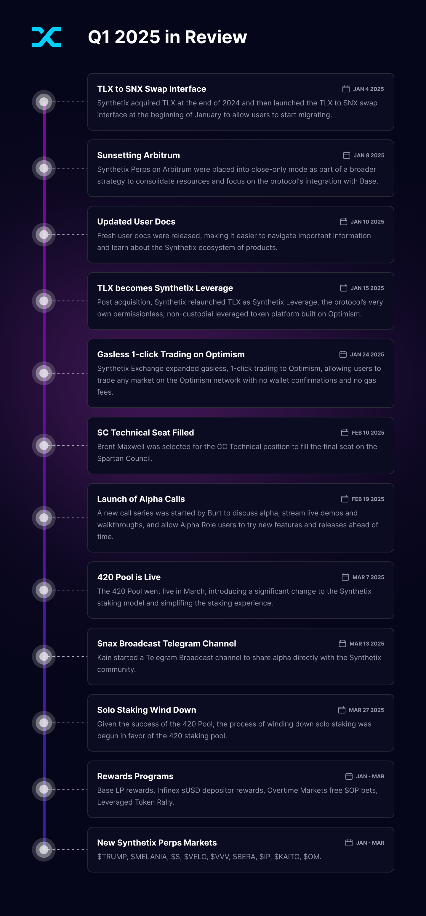 We’ve seen some major momentum shifts and meaningful progress at Synthetix in just the first quarter of 2025! From record-breaking migrations and the launch of the 420 Pool, to expanded Perps offerings, platform upgrades, and protocol acquisitions, signs of growth are visible on nearly every front. The strategic vision is on full display — largely fueled by last year’s governance shake-up referendum — and there’s a renewed commitment to improving accessibility, scalability, and user experience. Together, these developments mark a transformative start to the year and lay a strong foundation for what’s ahead.