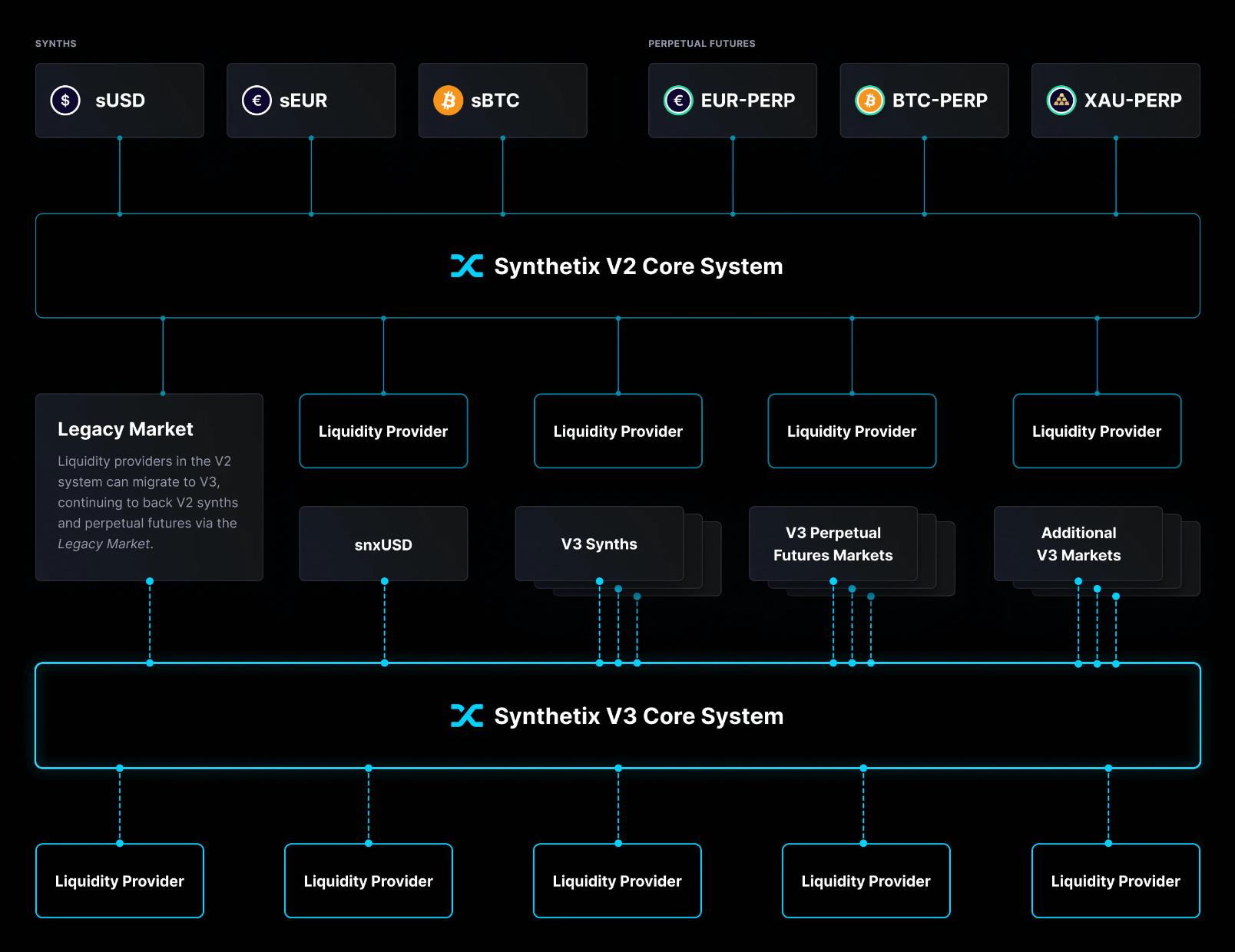 Zooming out, the migration plan entails the ability for the Synthetix V3 system to back the Synthetix V2 system via the “legacy market”. Liquidity providers in the V2 system will be able to drop their position into the V3 system with a single transaction and continue to collateralize the existing spot synths and perpetual futures markets.