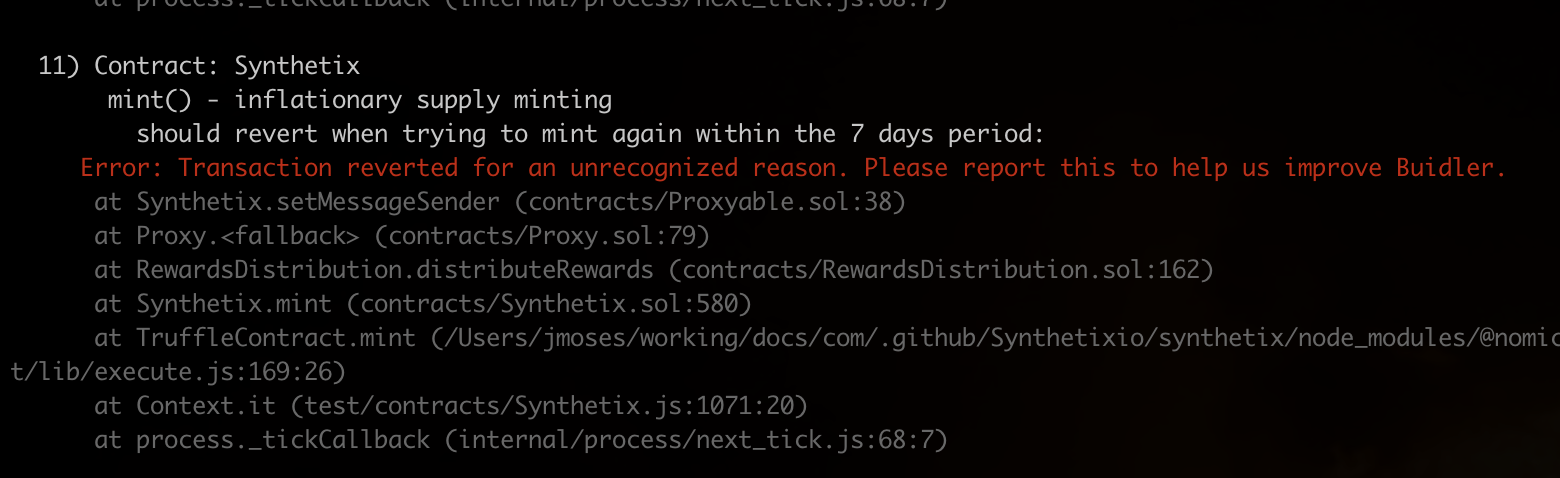 Above: This error (which incidentally is why we had to create ProxyERC20.sol in the first place last year) was one of the few that popped up during the migration. With these stack traces it was trivial to pinpoint the issue (saving us hours of development time).4. Legacy test injection