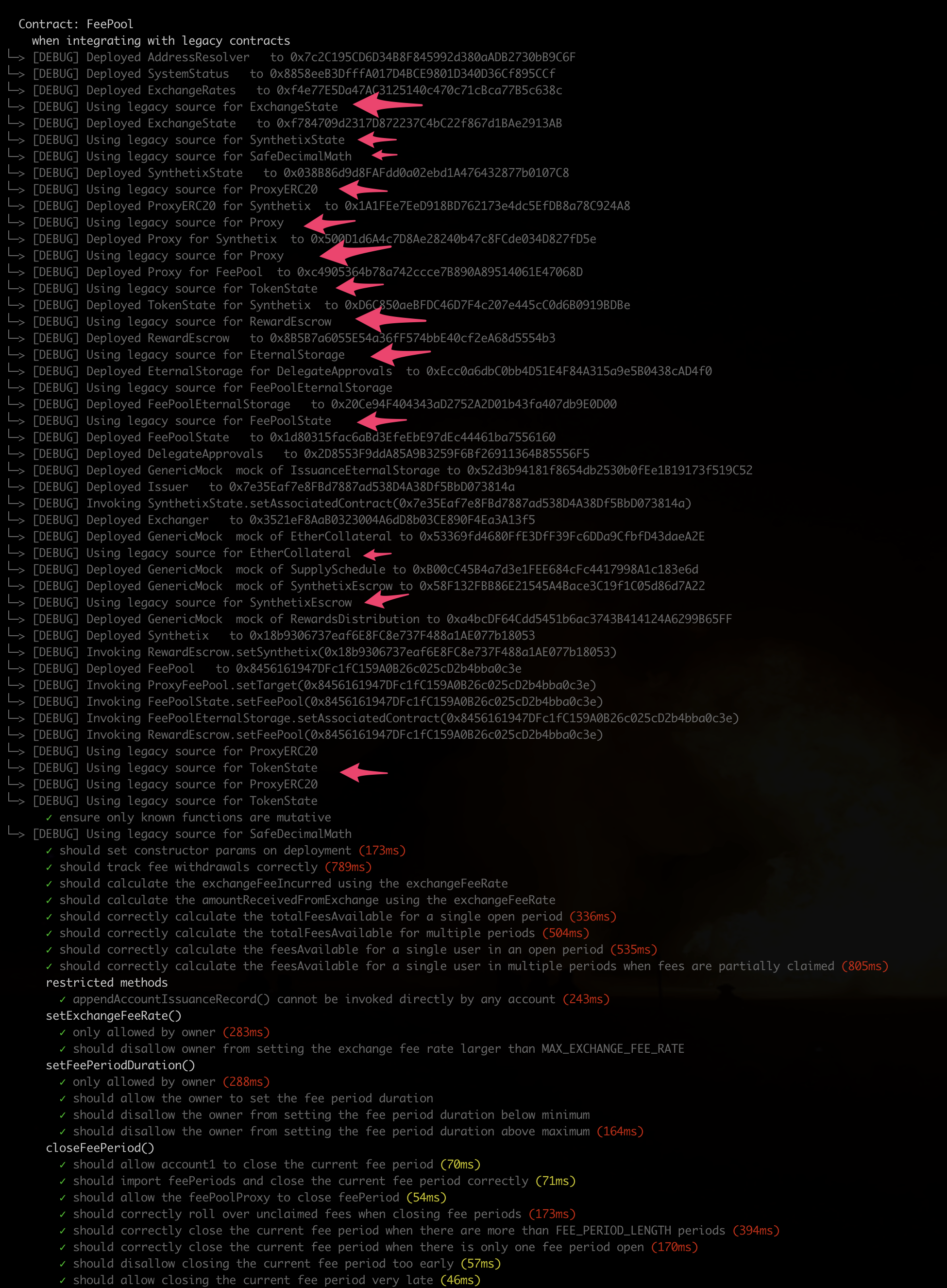 Above: Running the FeePool.js test suite in legacy mode5. Slither integration