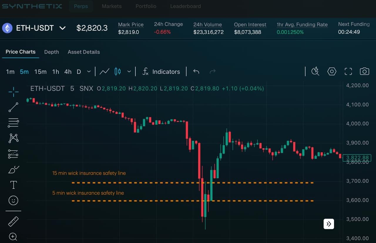 Wick Insurance is a novel feature that gives you a configurable grace period when your position temporarily breaches your liquidation level. Instead of instantly zeroing your account, Synthetix’s wick insurance will disable liquidations for a short period of time, allowing the market to prove whether it was just a wick or a real move.